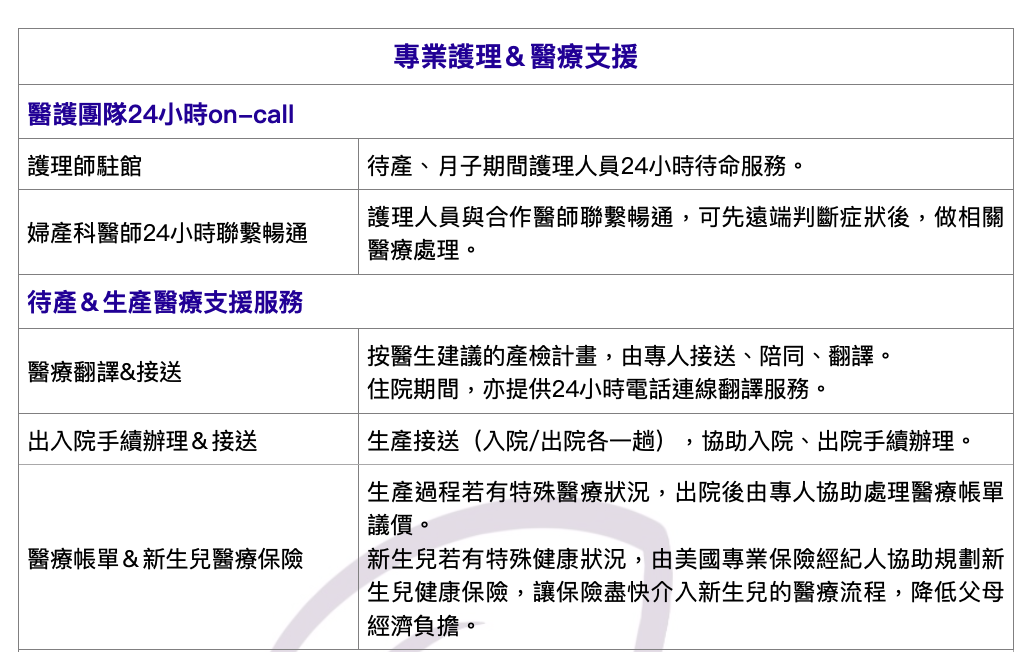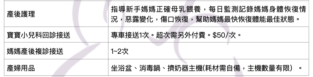 | 備註 1.小費另計:工作人員 $10/日,月嫂 $25/日 2.陪客費用:成人&6歲以上兒童:55 USD/天。 3-5歲兒童:10 USD/天。 未滿3歲不收費。 3.提早生產,待產2.5天換1天月子。 4.雙胞胎:21天月子方案 +$3750,28天月子方案+$5000,月嫂小費 $50/日 (單胞胎$25/日)。 |
